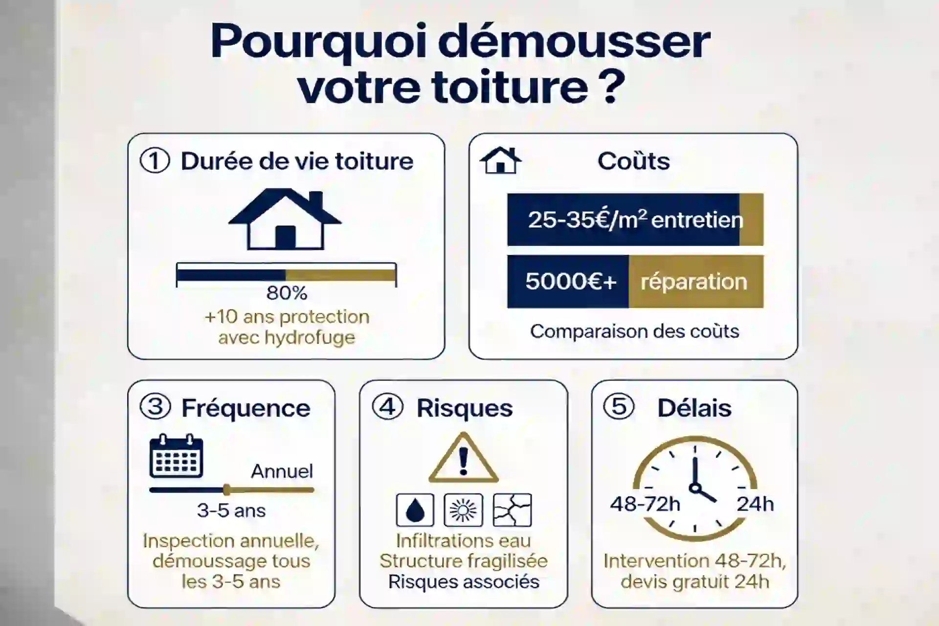 Il est recommandé de faire inspecter votre toiture annuellement. Si vous observez une teinte verte, grise ou noirâtre, des mousses, lichens ou algues sur le toit, c’est le moment d’agir. Le démoussage prévient les infiltrations d’eau et prolonge la durée de vie de votre couverture. Idéalement, choisissez une période sèche et tempérée (printemps ou début automne) pour optimiser la pénétration des traitements protecteurs.